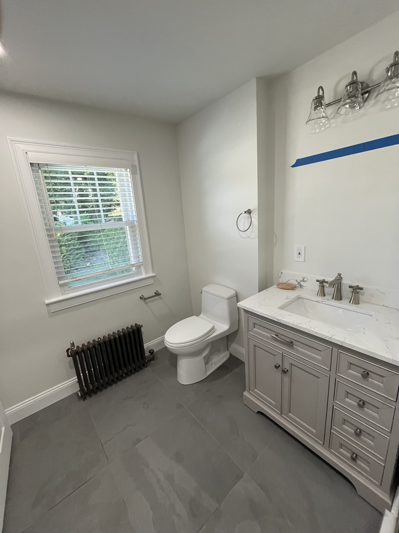 We upgraded the plumbing throughout the space, adding a new shower valve, drain connections, sink faucet, and toilet installation.