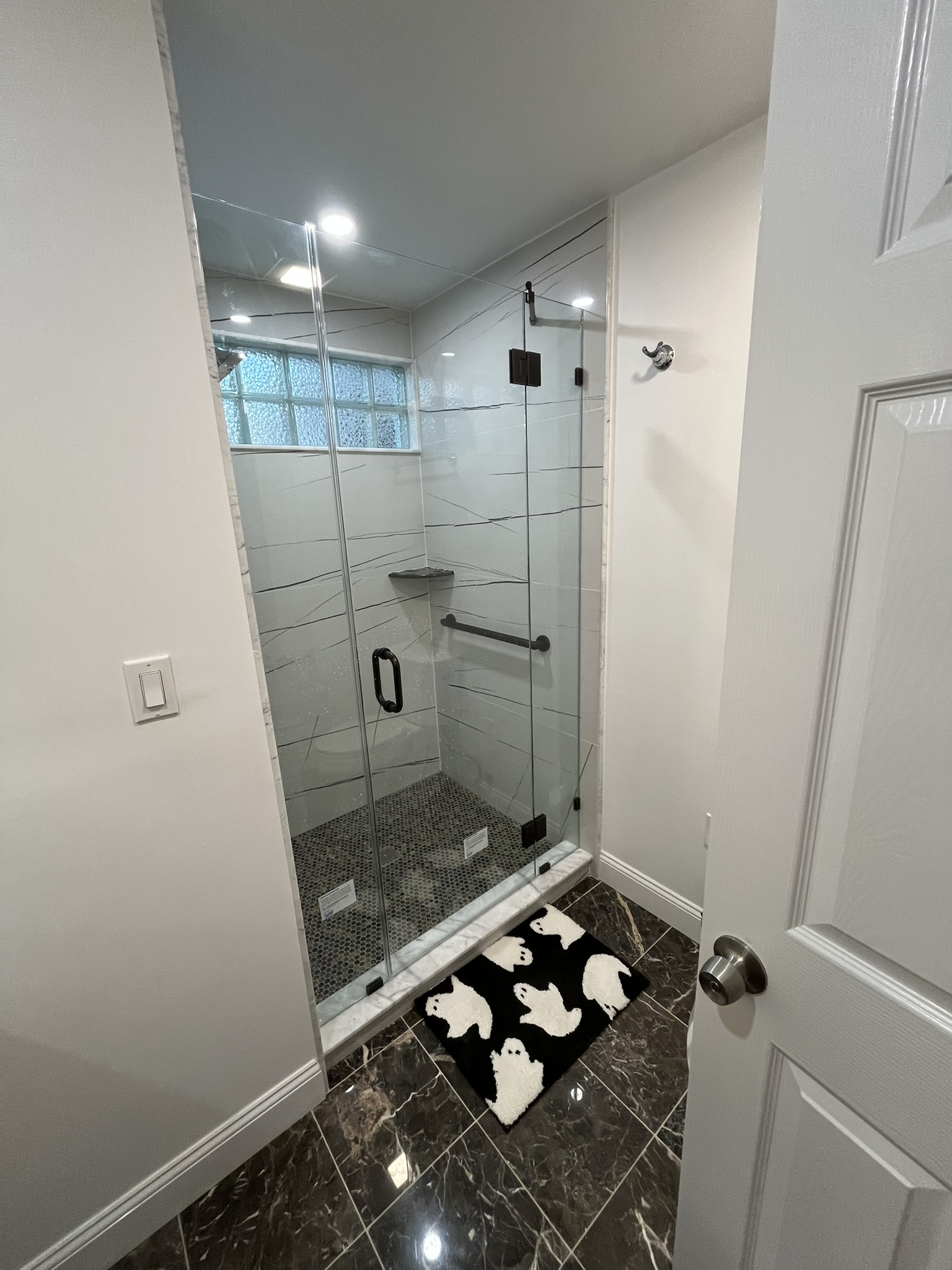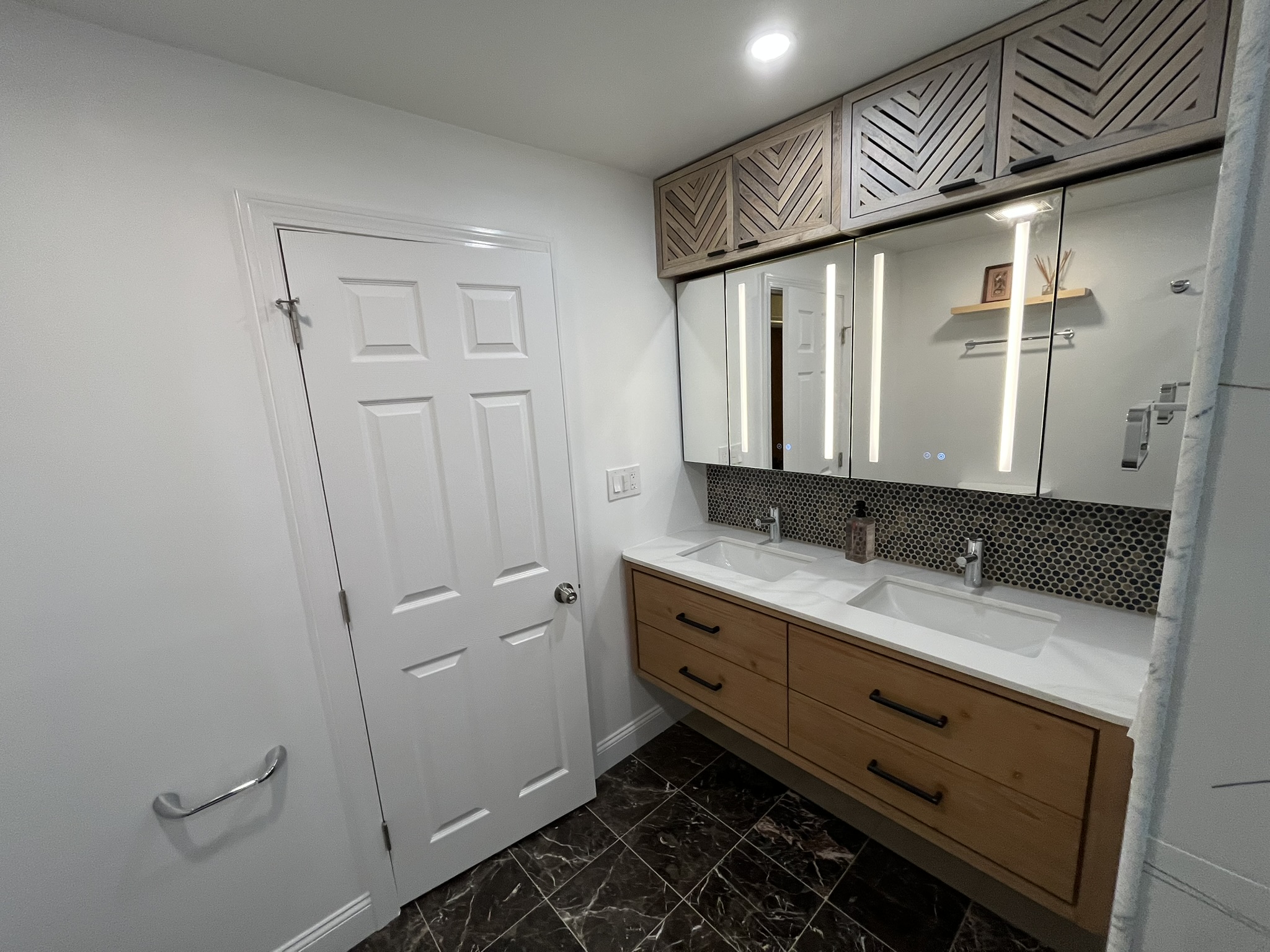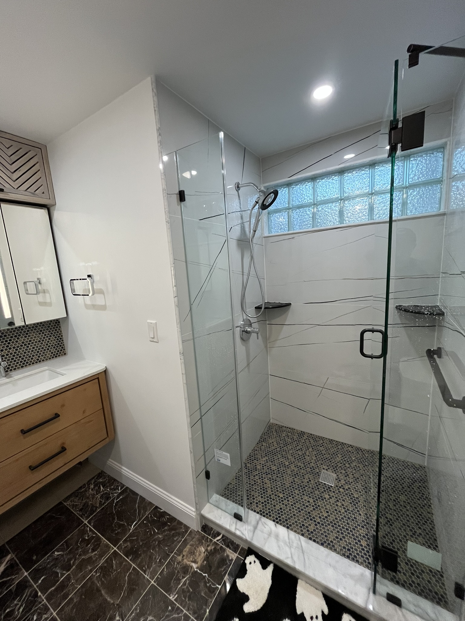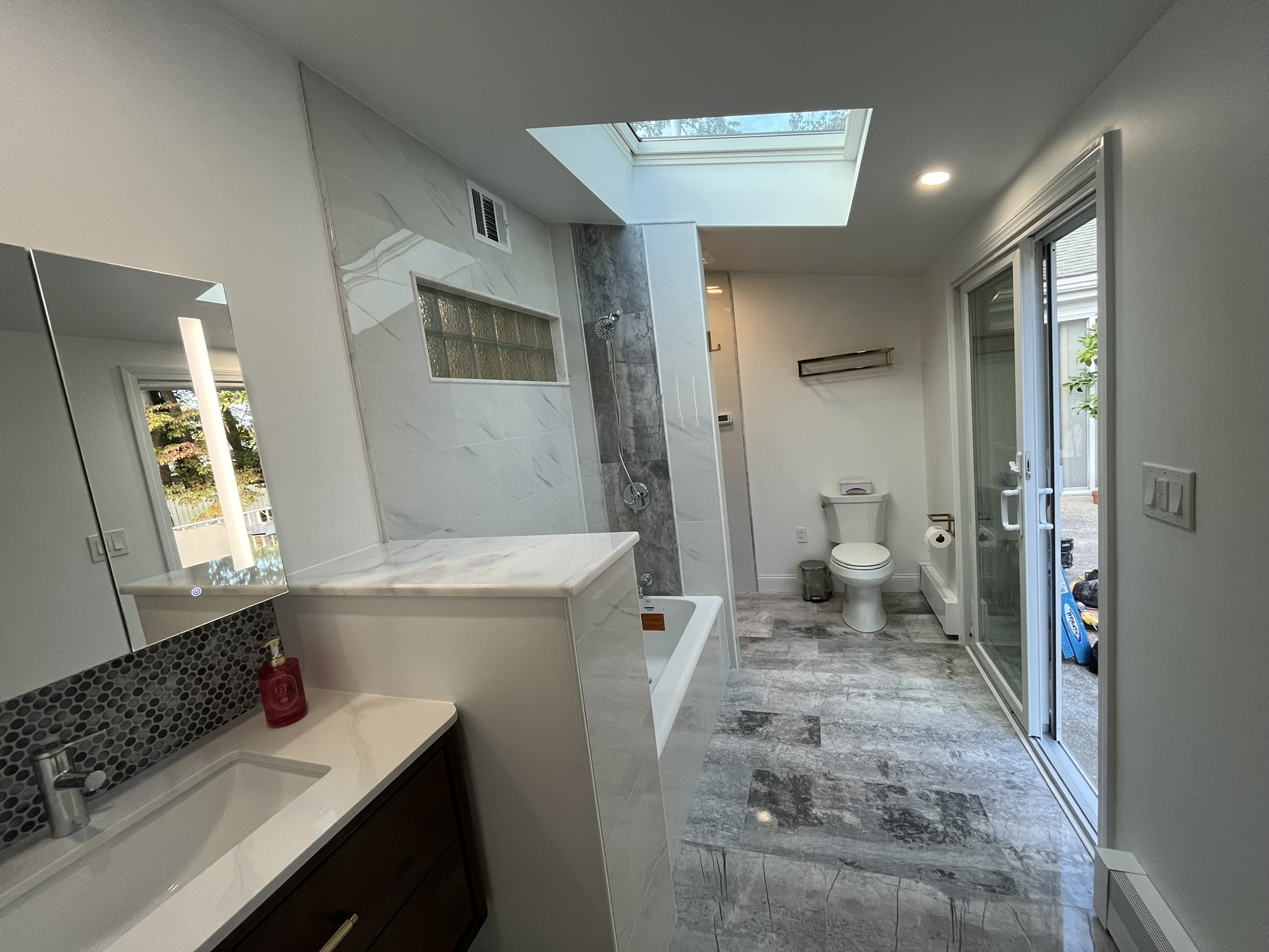 Sun Shore Construction completed a full-scale bathroom remodeling project in Newton, MA, transforming two outdated bathrooms into modern, spa-like retreats. The renovation included reconfiguring the layout, updating plumbing and electrical systems, and introducing premium finishes like custom walk-in showers, elegant tilework, and floating vanities. The result is a seamless blend of comfort, function, and contemporary design.