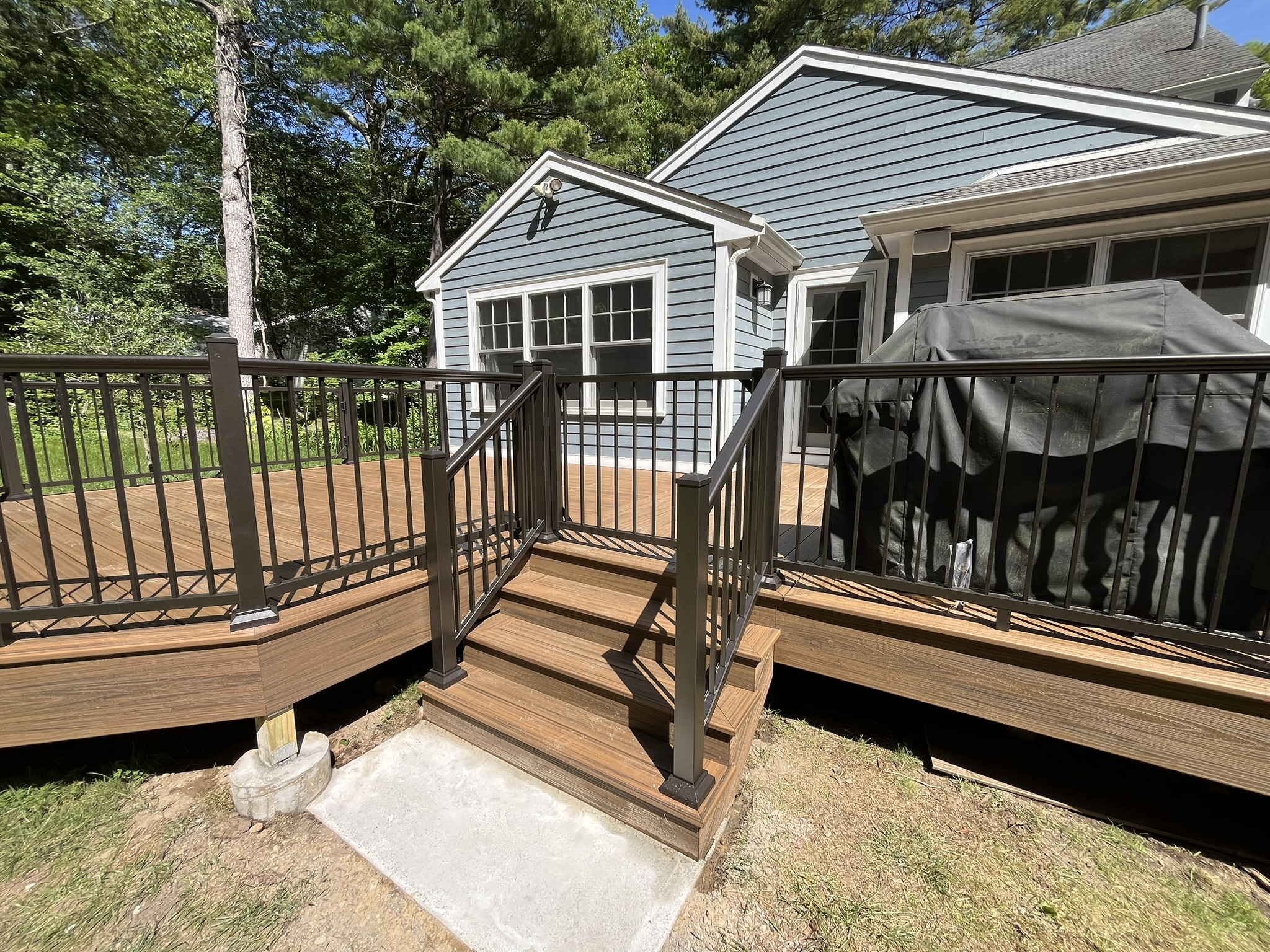 We started by removing the existing deck and rebuilding the frame from the ground up with added structural support through additional footings and posts. The newly expanded layout features a wider footprint with three custom staircases, each with its own concrete landing. For safety and convenience, child- and pet-friendly gates were installed at the top of each staircase.