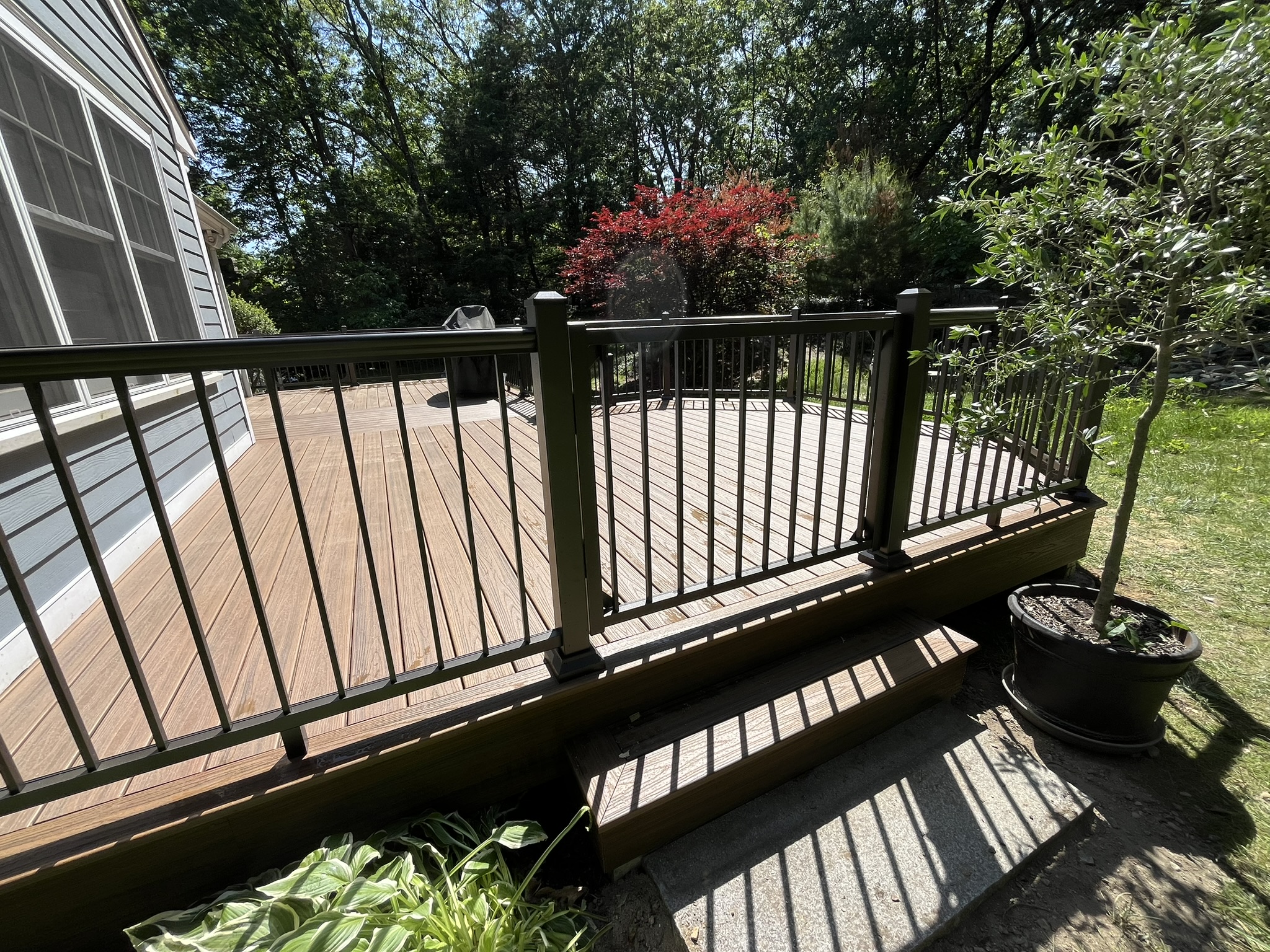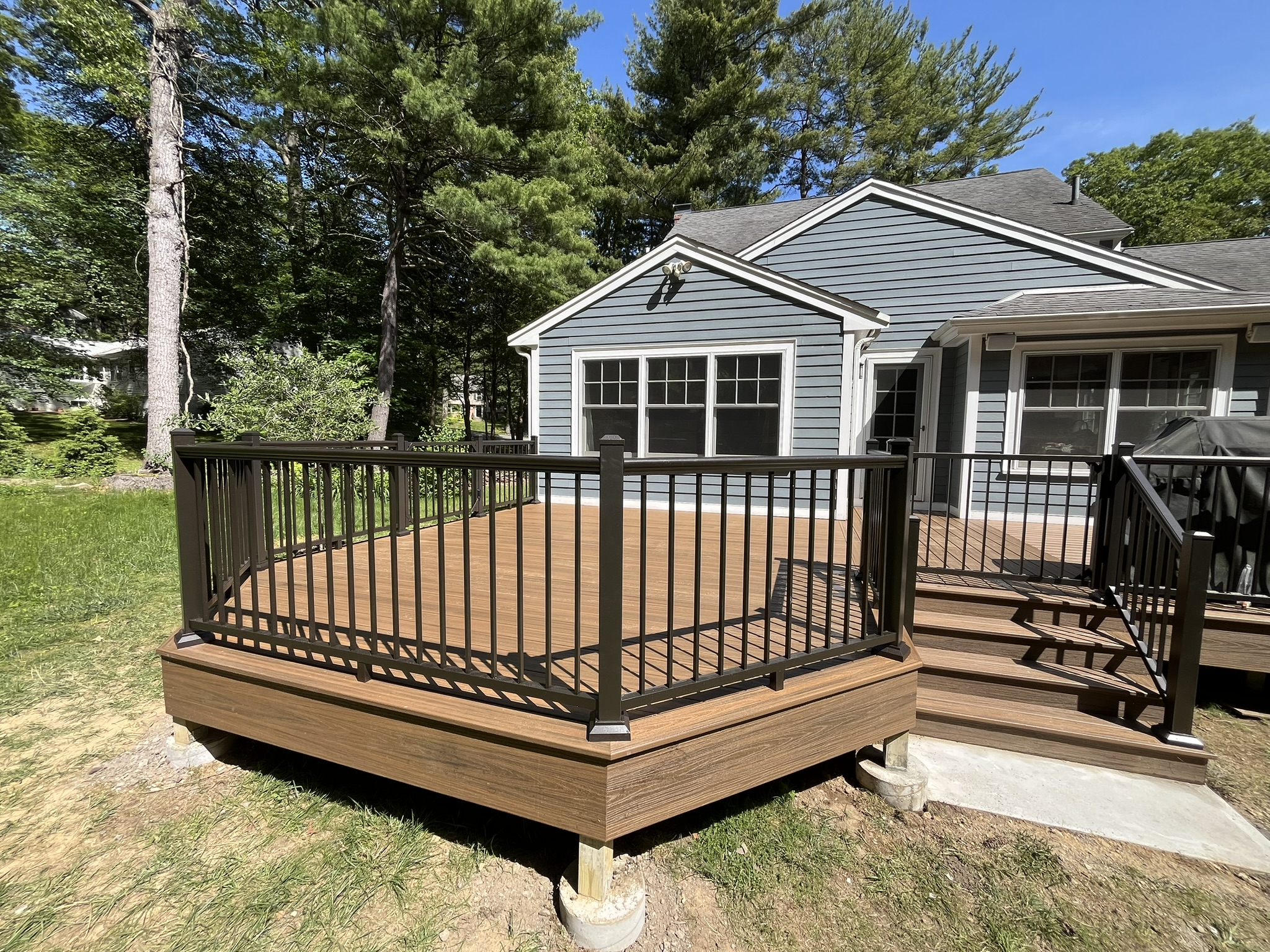 The standout feature of this project is the use of premium composite decking, offering a woodgrain look with weather resistance and minimal maintenance. The deck is bordered by stylish black aluminum railings that add both safety and modern appeal.
